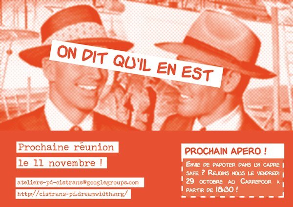 Toutes les infos et contact : ateliers-pd-cistrans [ @ ] googlegroups.com et sur notre blog : http://cistrans-pd.dreamwidth.org/