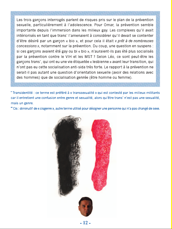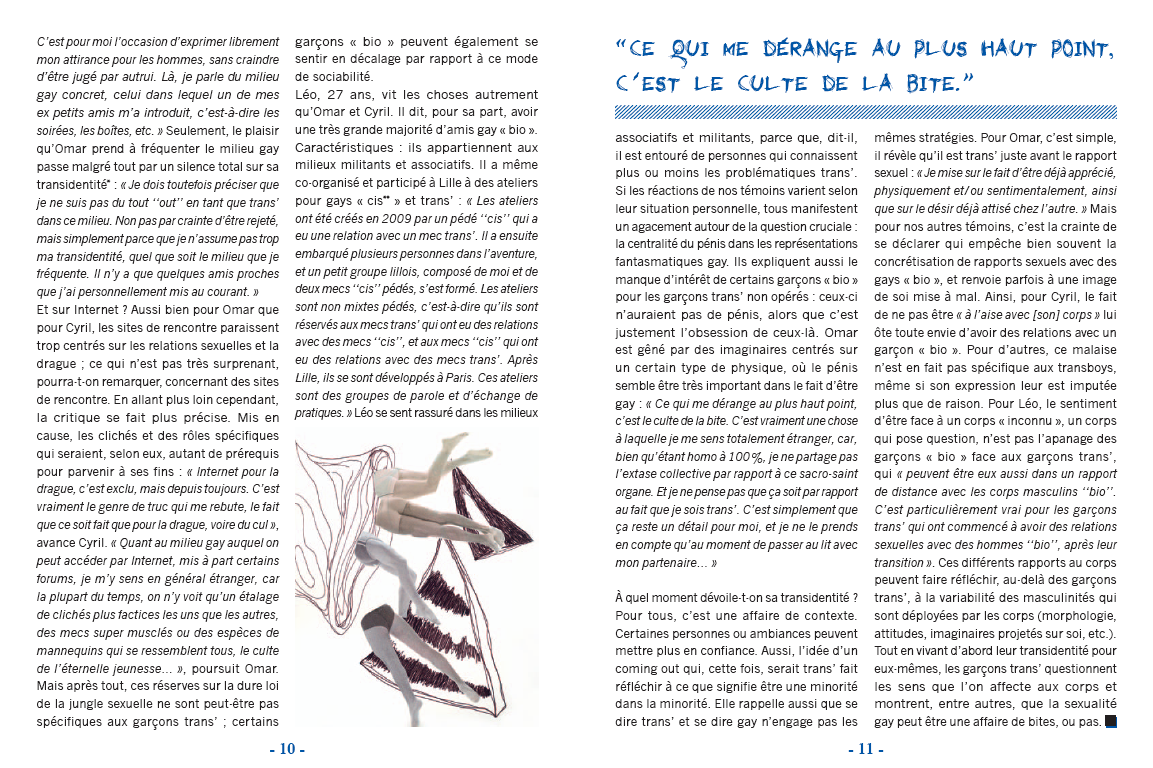 Dans le numéro10 du petit magazine des sexualités gay "Prends-Moi", réalisé via l'INPES (Institut National de Prévention et d'Education à la Santé), il y a trois pages d'interviews d'hommes trans sur leur sexualité et leur rapport au milieu gay: