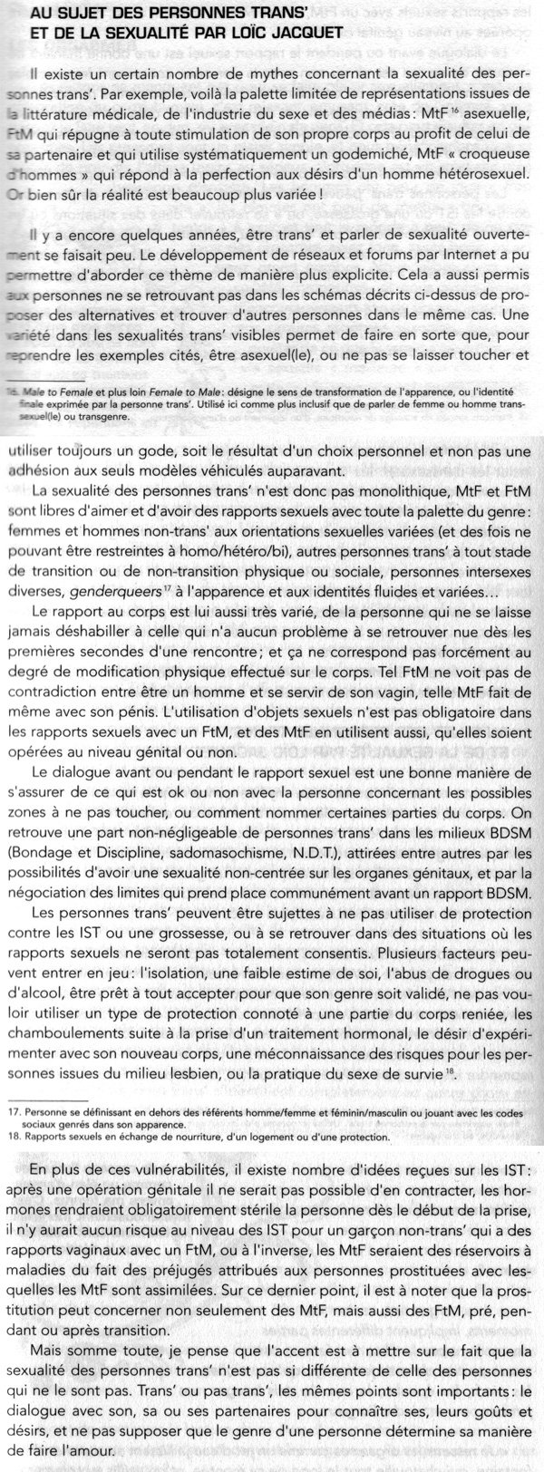 Article: Au sujet de la sexualité trans (JPG). Edité dans "Le Petit Guide de la sexualité épanouie", 2009.